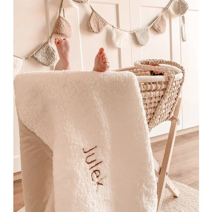 Eine weiche und leichte Decke aus Teddyfell und Musselin-Baumwolle. Dank Personalisierung ist es ein schönes Geschenk zur Geburt eines Kindes oder zur Taufe und bleibt ein schönes Andenken.